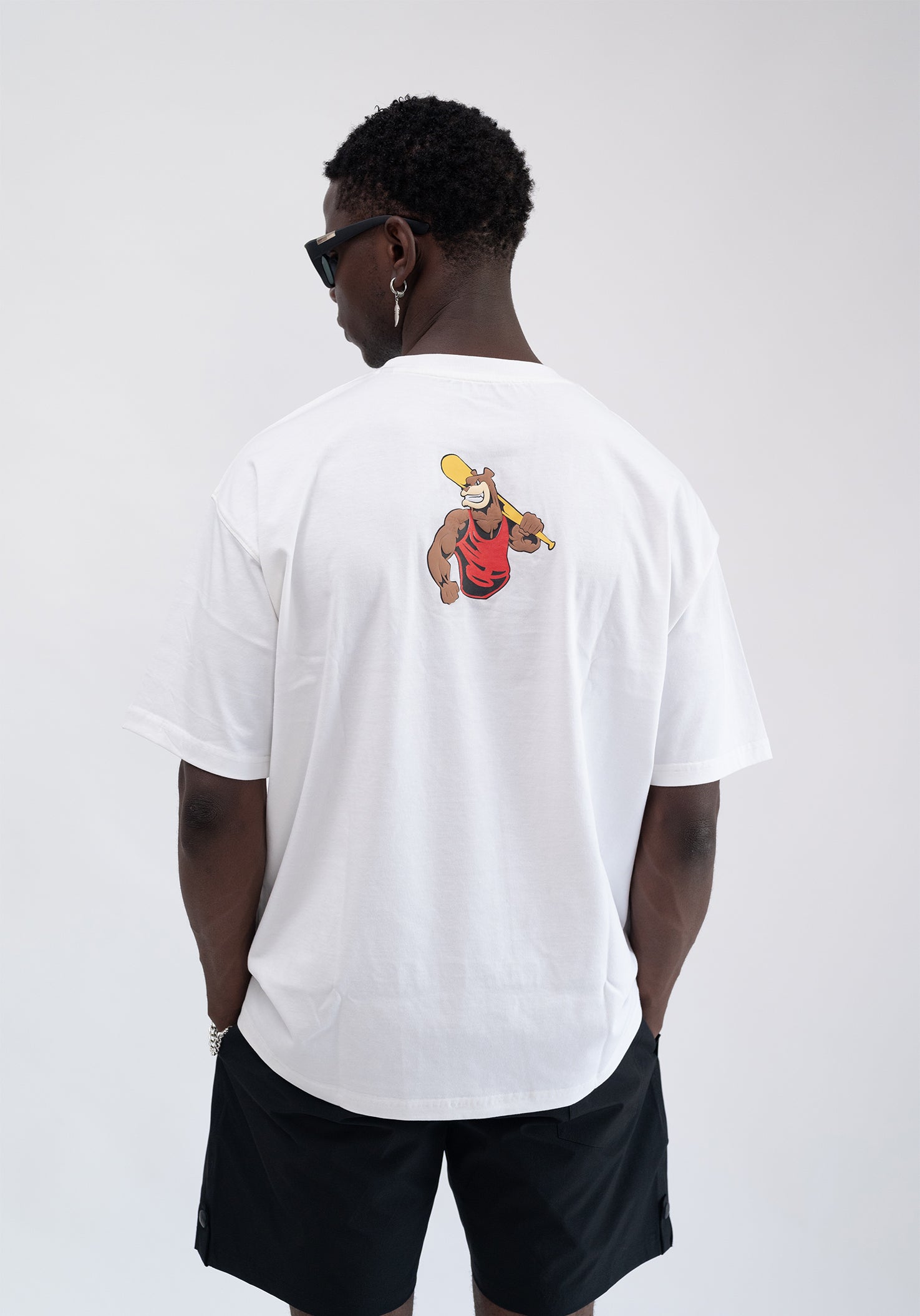This oversized T-shirt in pure white is made from compact cotton with the intricate detailing of the bear, coupled with the dynamic pose and baseball bat, adds a touch of attitude and charm to the overall design. It’s a visual representation of strength, determination, and a hint of playfulness.