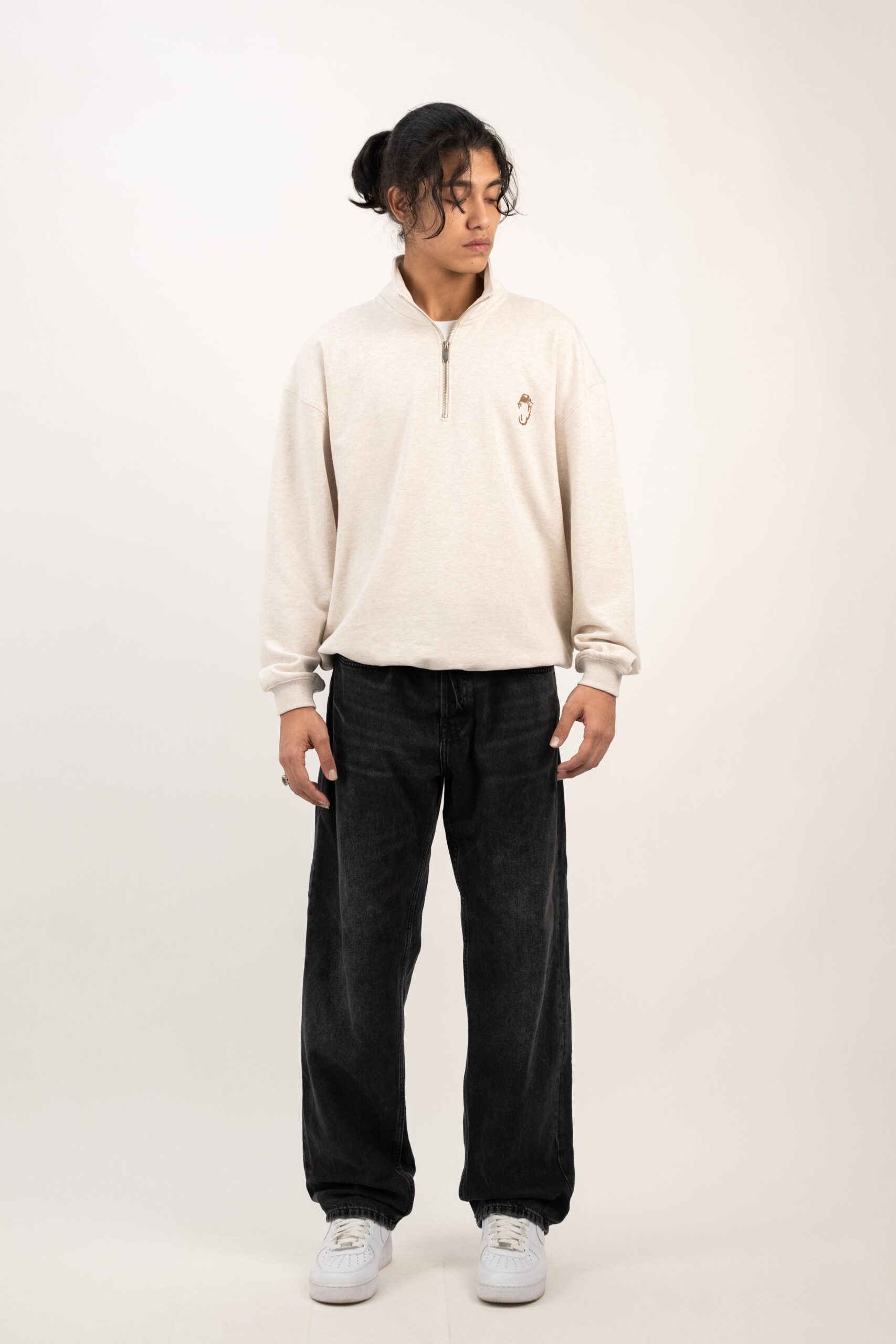 Cut from triple thread french terry, this piece brings a clean, structured silhouette with a slightly oversized fit. The metal quarter zip adds a sleek edge which is easy to layer but hard to ignore. Finished with our minimal fangs logo at the front, it’s your refined switch-up from the usual crewnecks and hoodies.