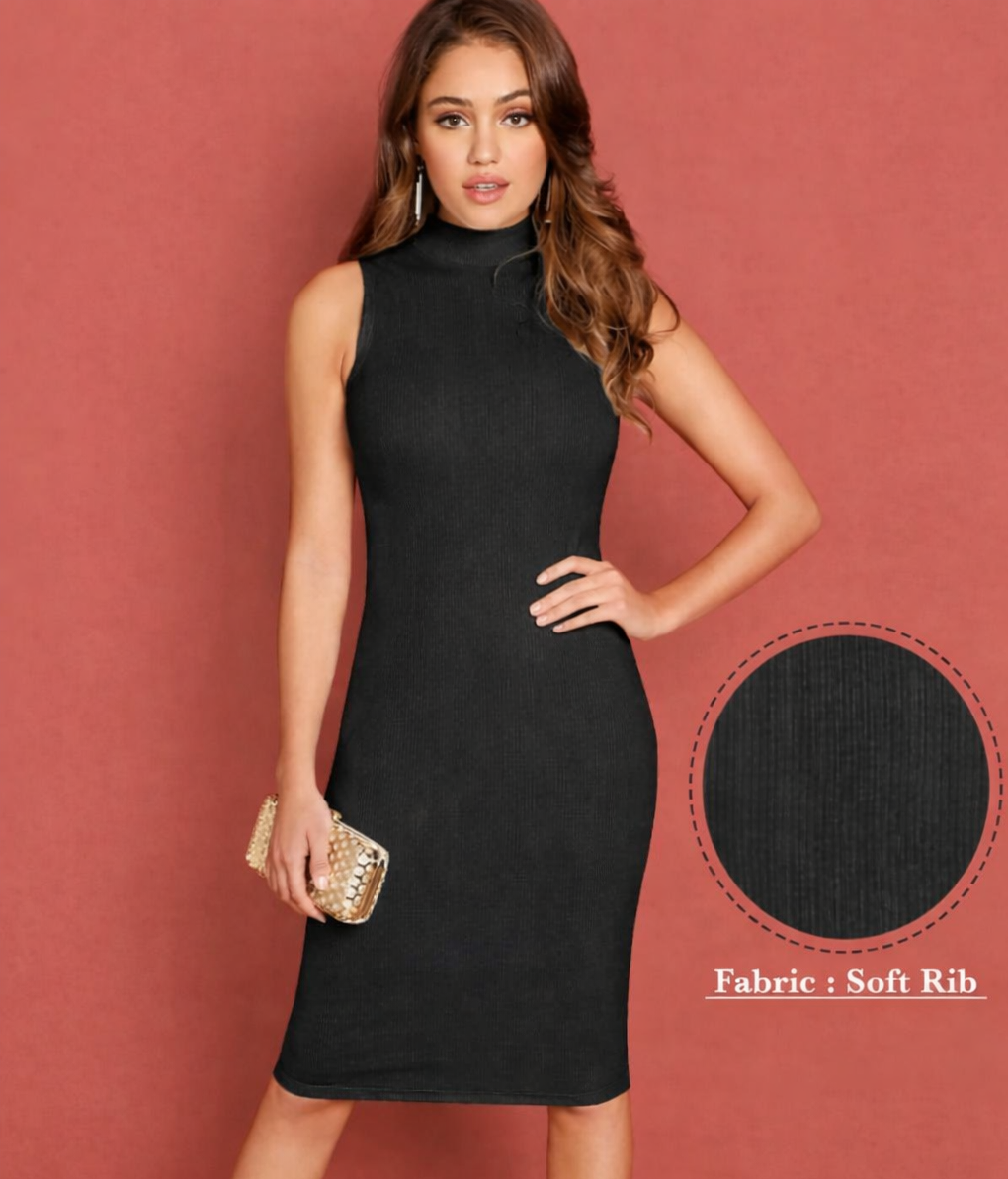 A sleek and stylish black ribbed bodycon midi dress designed to enhance your silhouette. Featuring a modern high-neck design and soft ribbed fabric, this dress is perfect for parties, evening outings, or casual fashion styling.